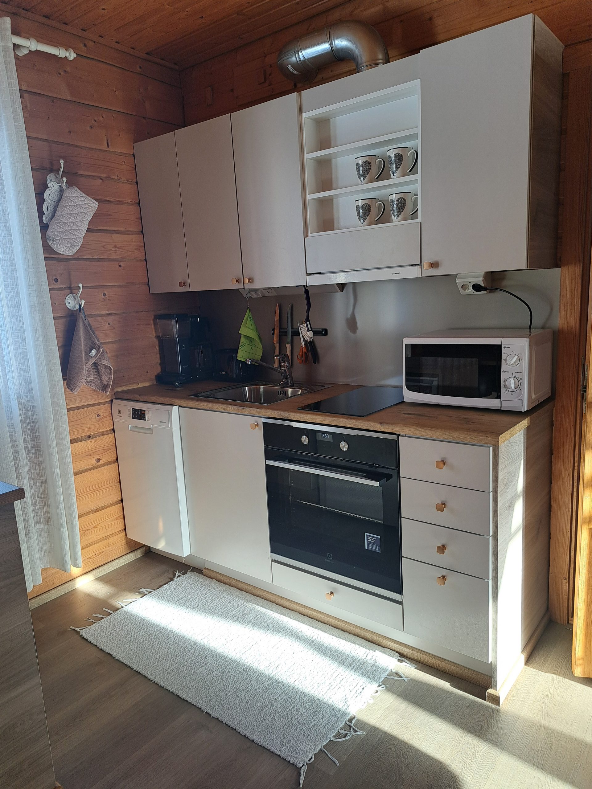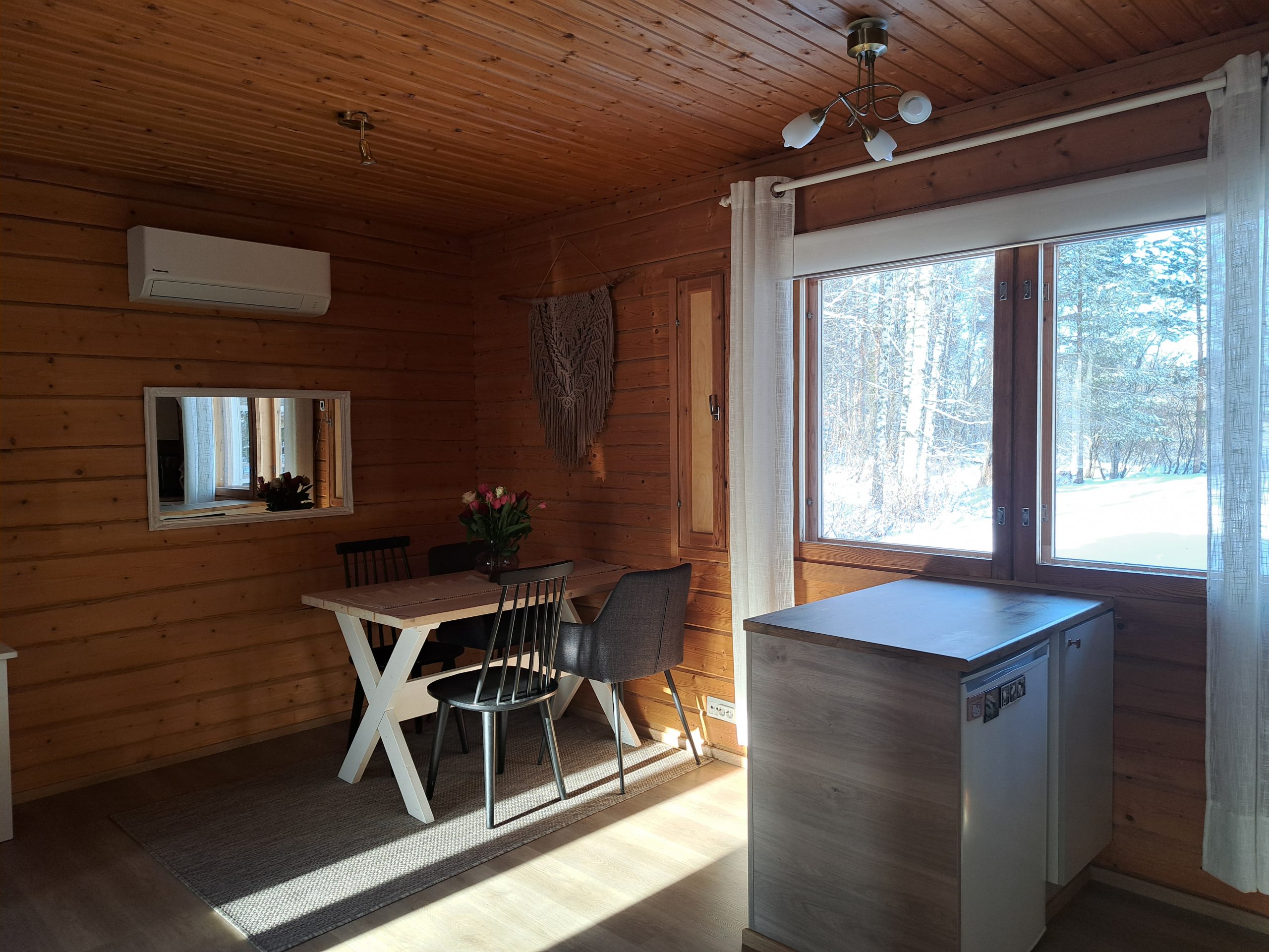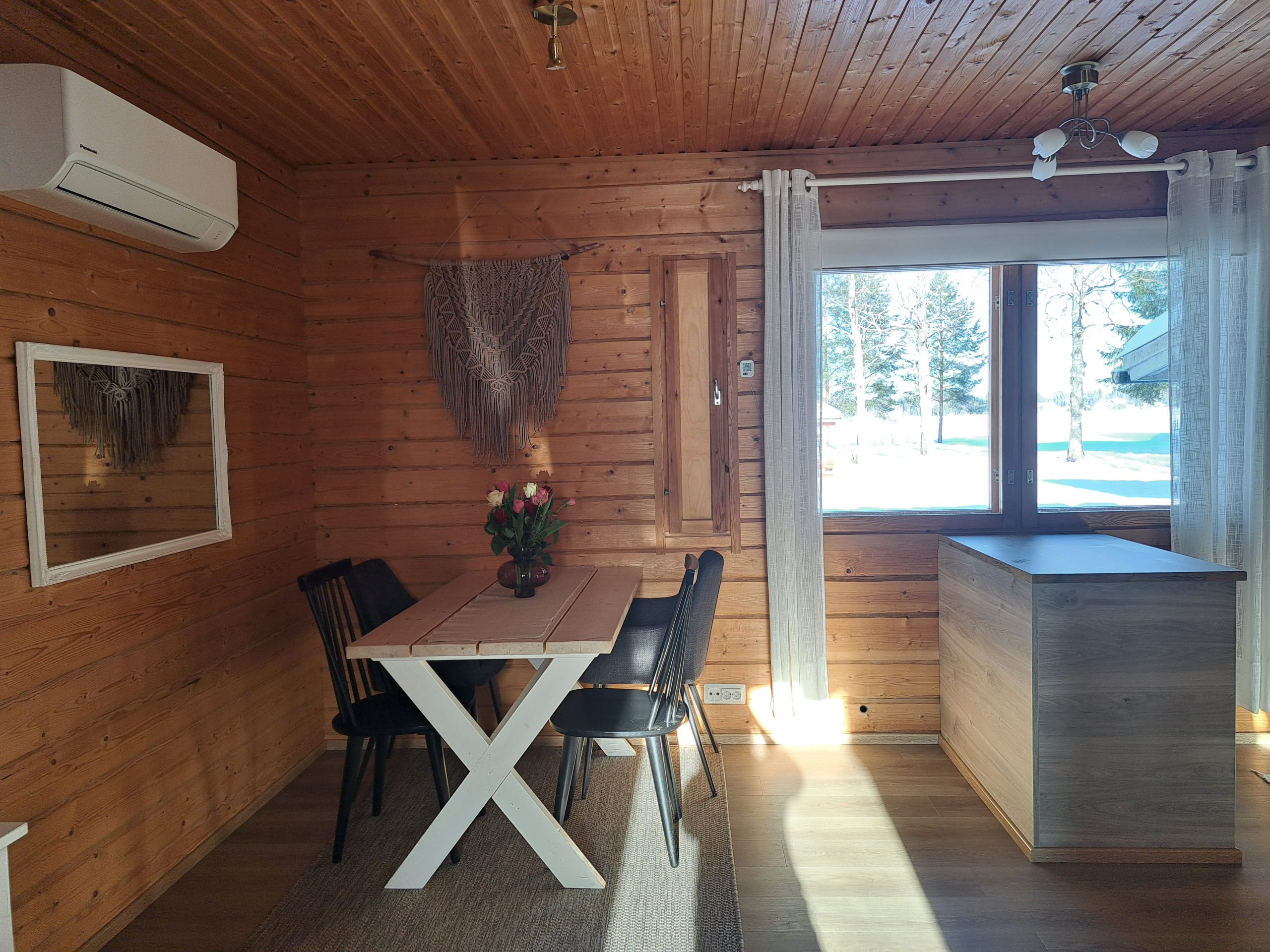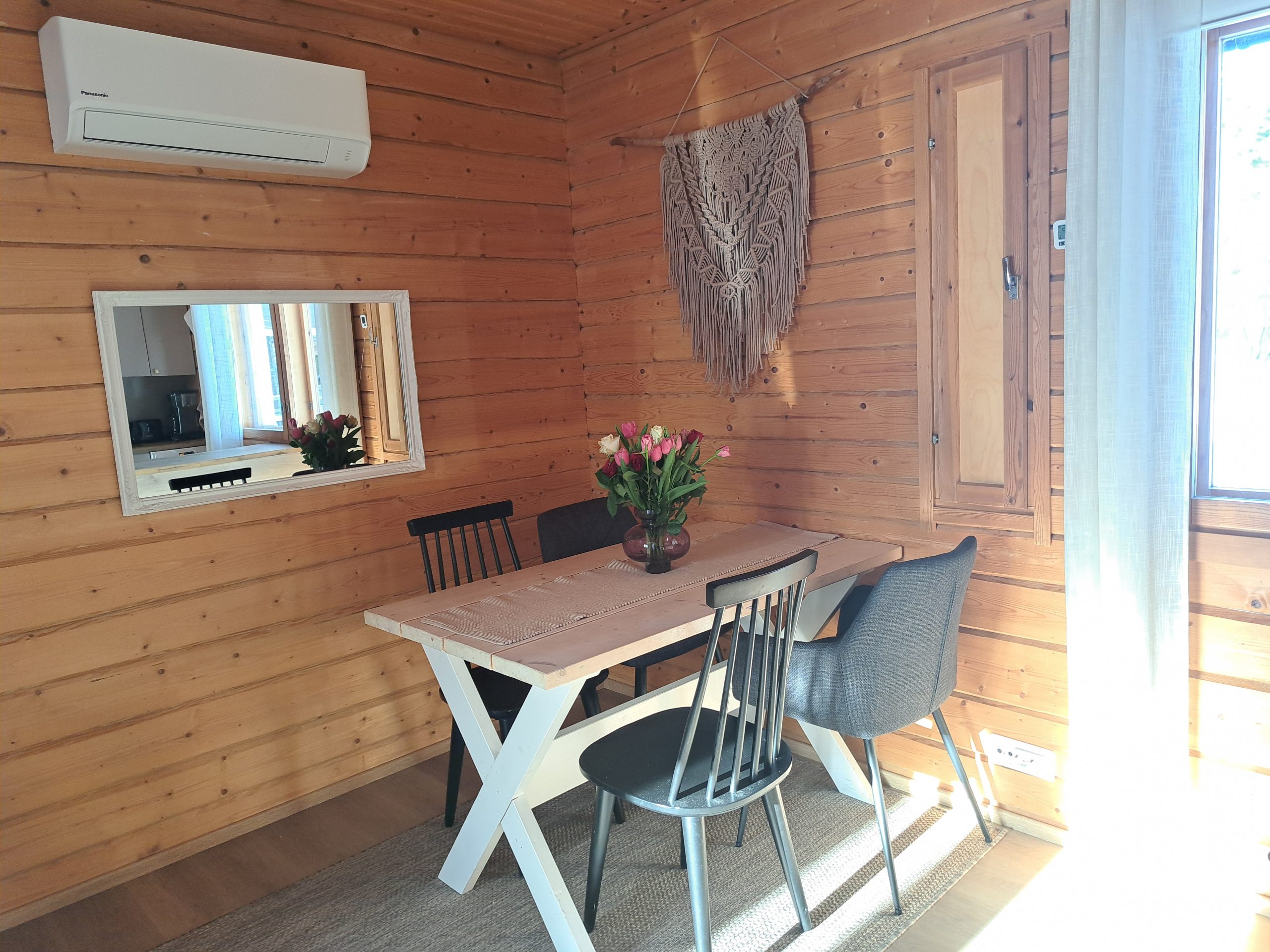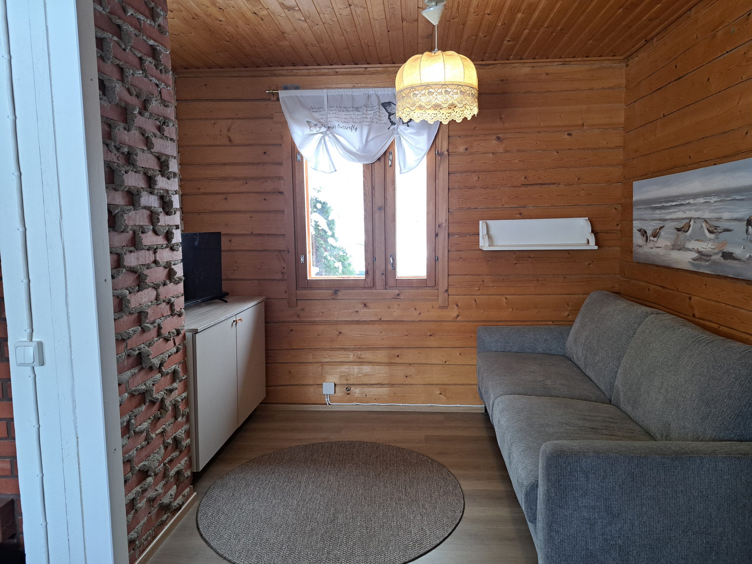 Varustus: Ilmalämpöpumppu, sähkö, varaava takka ja takkapuut, vesi kunnallisesta vesijohtoverkosta, suihku, sähkösauna, sisä wc, keraaminen keittotaso, jääkaappi pakastelokerolla, mikro, kahvinkeitin, leivänpaahdin, sähkövatkain, kuuden hengen astiasto aterimineen, ruuanlaittoon tarvittavat välineet, astianpesukone, pyykinpesukone, vauvan sitteri, tv, dvd-soitin, hiustenkuivain, takaterassi, grillikatos, soutuvene, kelluntaliivit vauvasta aikuisille, SUP-laudat 2 kpl ja lumikengät 2 paria.